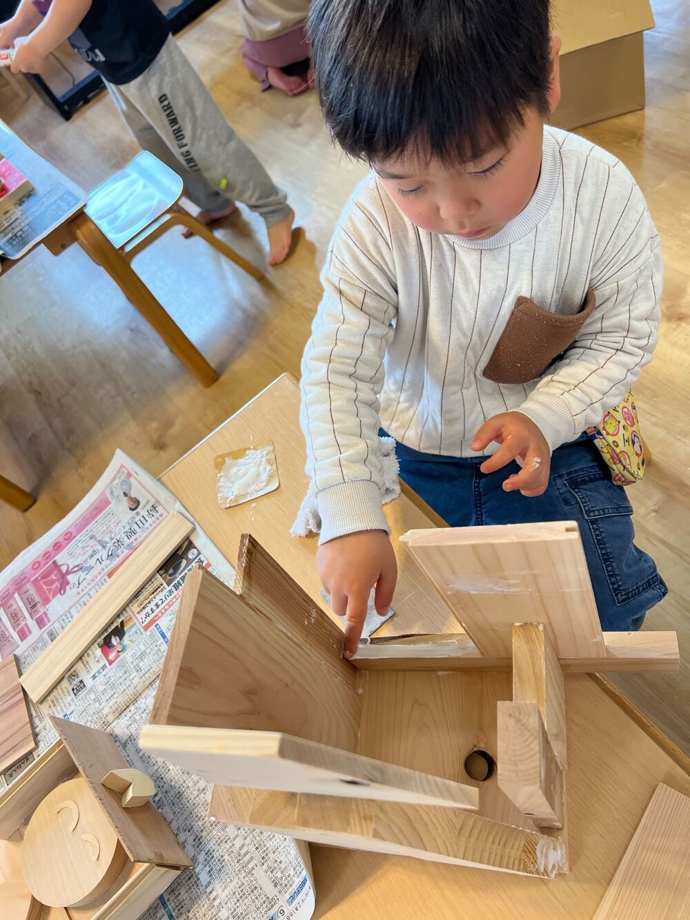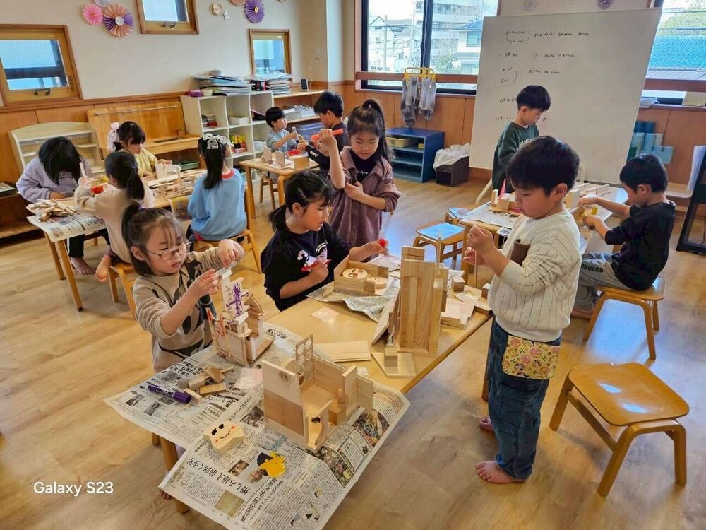 このプログラムでは、国産の本物の木材を使い、子どもたちが五感を使って素材と向き合いながら自由に創作を楽しみます。